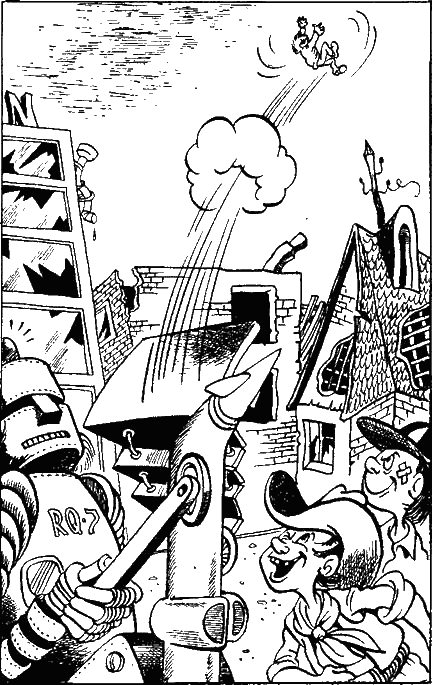 Не прошло и минуты, как прикатила механизированная ракетница-самокат, на ней было написано: «Ракетой – на всемирную свалку!». Ею управлял железный робот с рыжими бакенбардами.