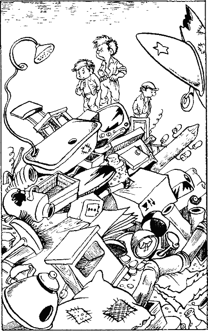 Пыль рассеялась, все улеглось. Жорка сел, чихнул и наконец сообразил, что жив и что угодил не просто в кучу мусора, а на всемирную свалку. Куда ни кинь взгляд – поломанные стулья, изодранные коврики, дырявые мячики, расколотые тарелки и чашки, обшарпанные головы плюшевых и бархатных мишек и зайцев, пожелтевшие листы, вырванные из книжек с картинками, бутылки с отбитыми горлышками, облезлые фотографии, прохудившиеся шапки, раскрашенные бумажные змеи, ботинки, которые просят каши, и всякие лоскутки, клочки, обрывки, осколки – не поймешь от чего. Среди груд этого хлама, рухляди, ветоши и тряпья кое-где выглядывали ржавые остовы автомашин, рыжие батареи парового отопления, искореженные шкафы и другая всякая всячина.