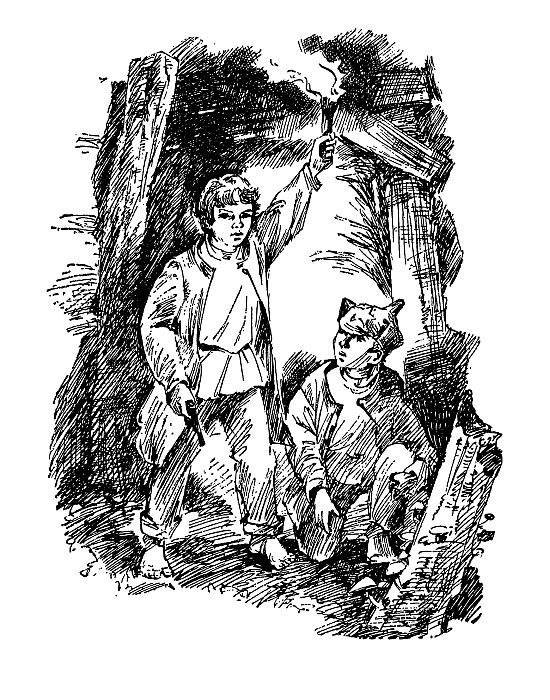 Первым проснулся Пантушка. В полной темноте он долго не мог сообразить, где находится, вскочил, больно ушибся головой о камень, вскрикнул. И вдруг вспомнил все. Достал банку из-под ваксы, где у него хранились огниво, кремень и тряпичный жгут, стал высекать огонь. Когда жгут затлел, он поднес к нему кончик кудели, выдернутой из кожуха, стал дуть. Кудель вспыхнула, от нее зажегся берестяной факел.