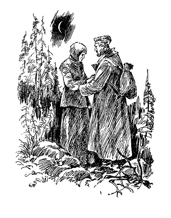 Ребята в последний раз оглянулись на Авдотью и замерли от удивления. Перед Авдотьей стоял бородатый человек. Он положил руку Авдотье на плечо, она встала и пошла рядом с ним. Вскоре их скрыла лесная чаща.