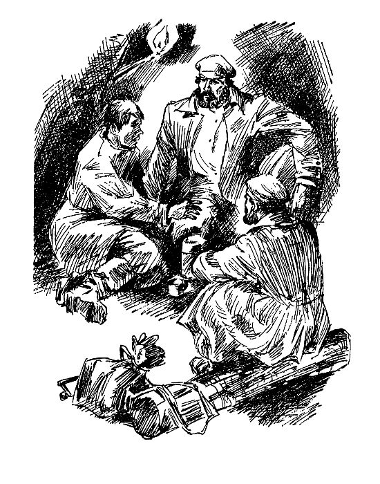 В каменоломне, освещаемой коптящей лучиной, сидели трое. На разостланном грязном полотенце лежали куски вареной курятины, хлеб, ватрушки, пирог с солеными грибами.