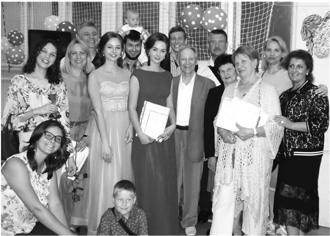 Наша Большая семья: я с женой Галиной, сыновья Александр и Сергей, внуки Сергей и Владислав, внучки-близнецы Аня и Юля, правнук Женя и правнучка Кира, жена сына Александра – Инга, жена сына Сергея – Марина, жена внука Сергея – Ирина, сестра Марины – Света, сватья Юлия (мама Марины и Светы) и Саша – дочка Светы и внучка Юлии. Снимок сделан на выпускном вечере, на котором Аня и Юля получили золотые медали и красные аттестаты зрелости