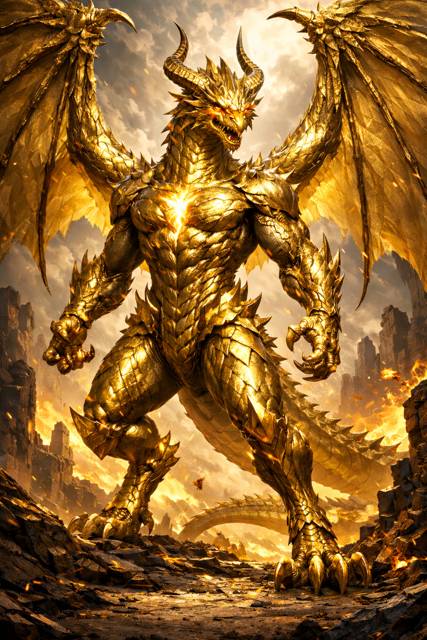 Его тело вытягивается, но общие размеры остаются прежними. Крылья, казавшиеся огромными, теперь смещаются немного назад, принимая более обтекаемую форму. Мускулы под золотой чешуей перекатываются, грудная клетка расширяется. Интересное происходит с конечностями: передняя пара лап теперь подозрительно напоминает развитые гуманоидные руки с цепкими, сильными пальцами, способными не только хватать, но и манипулировать. Задние же ноги мощно укрепились, став толще, мускулистее, способными выдерживать вертикальную нагрузку.