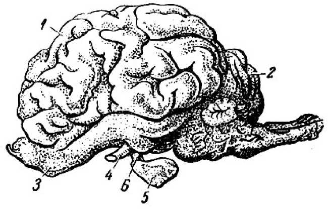 Рис. 25. Головной мозг коровы: 1 – большой мозг; 2 -мозжечок; 3 – обонятельная доля мозга; 4 – отрезок зрительного нерва; 5 – гипофиз, соединенный с мозюм ножкой; 6 – ножка гипофиза