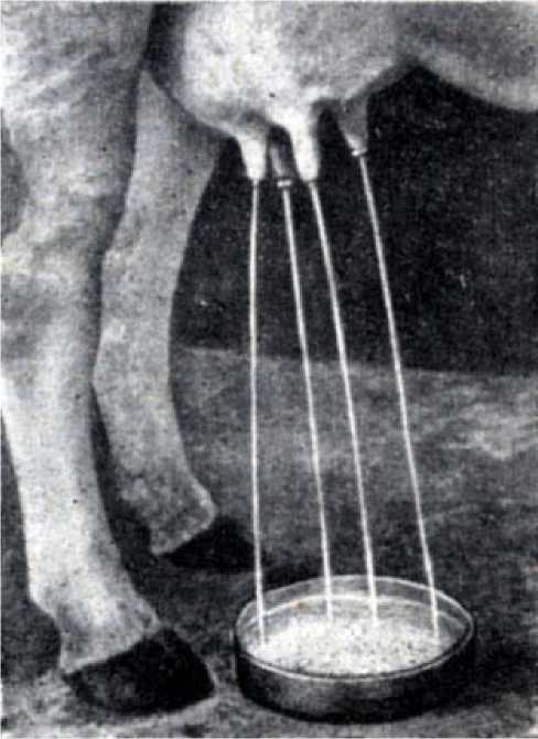 Молоко в вымени образуется непрерывно, если этому не препятствует его переполнение. После заполнения альвеол и протоков молоко, как мы знаем, периодически переходит в цистерны. При доении сфинктер соска раскрывается. Сначала опорожняется цистерна, затем протоки, в заключение начинает поступать молоко из альвеол. Если вставить в соски наполненного молоком вымени трубочки-катетеры, то вначале молоко вытекает сильными струями (рис. 26). Но таким путем удается извлечь из вымени меньше половины удоя. К моменту доения в цистернах находится примерно четверть удоя.