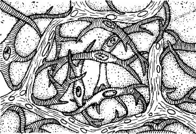 Рис. 27. Альвеола (сильно увеличена и упрощена). Наружная сторона альвеолы покрыта звездчатыми клетками, способными сокращаться