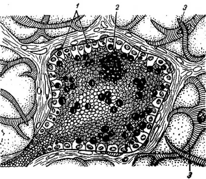 Рис. 28. Альвеола в разрезе: 1 – секреторные клетки; 2 -внутри альвеолы видны гроздья жировых шариков; 3 -звездчатые клетки