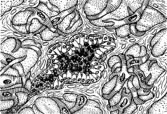 Рис. 29. Альвеола в разрезе, в сжатом состоянии; сжатие произошло под действием окситоцина. Жировые шарики собраны в гроздья. Гроздья жира частично выходят через узкий канал альвеолы