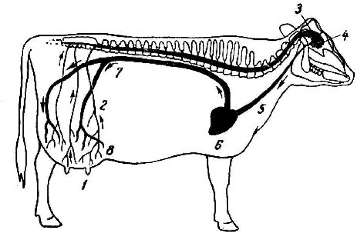Рис. 30. Рефлекс отдачи молока: 1 – стимуляция молочной железы (указывают стрелки); 2 – импульсы направляются к мозгу; 3 – головной мозг; 4 – гипофиз; 5 – гормоны перешли в кровь; 6 – сердце; 7 – гормоны направляются к вымени; 8 -гормоны выи зывают сжатие альвеол