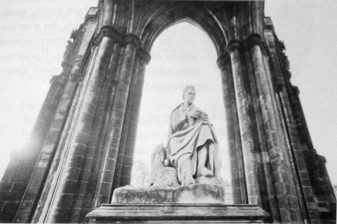 Разумеется, первым делом я стал расставлять в нем литературные вешки. Одна вешка – простая и очевидная. Это памятник Вальтеру Скотту неподалеку от гостиницы в центре, где нас поселили. Мы наткнулись на него почти сразу, как в первый раз вышли прогуляться, но не сразу признали, потому что памятник необычный: он помещен внутрь сквозной «беседки», моментально напомнившей мне рыночный крест в Чичестере, только в готическом стиле. Я подошел и дважды поклонился в пояс: один раз за «Айвенго», другой раз – за Смальгольмского барона.
