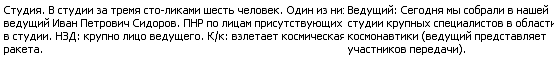 Попросите на студии сценарий телевизионной передачи... Скорее всего, вам предложат рукопись такого вида: лист разделен пополам, с левой стороны написано про то, что должно быть изображено на экране, а с правой – слова, которые произносятся за кадром или в кадре участниками передачи. Ну, примерно так: