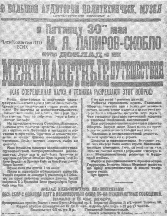 В последних числах мая 1924 года на улицах Москвы были расклеены афиши, которые привлекли внимание почти каждого прохожего. И неудивительно: первое, что бросалось в глаза на этой афише, были слова: «Межпланетные путешествия». Это было объявление о докладе М. Я. Лапирова-Скобло.