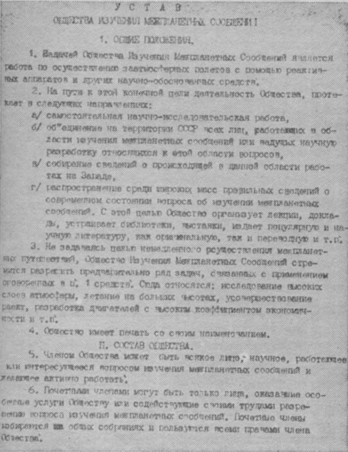 «Задачей Общества изучения межпланетных сообщений является работа по осуществлению заатмосферных полетов с помощью реактивных аппаратов и других научно обоснованных средств».