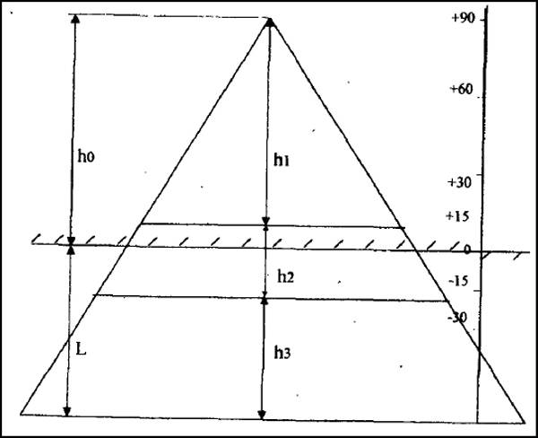 Вычисления, к которым мы приступили, имеют цель доказать, что пирамиды Хеопса (Хуфу), Хефрена (Хафра) и Микерина (Менкаура) Мемфисского некрополя представляют собой «записанные» на песке параметры Великой Незримой пирамиды – святилища бога Осириса. Исследуем, как объемы трех пирамид вольются в объем Незримой пирамиды, образуя три слоя – верхний, средний и лежащий у основания нижний, и вычислим геометрические характеристики образующихся слоев и границ между ними. Доказательством существования трехслойной Незримой пирамиды будет гармония чисел, характеризующих ее геометрию.