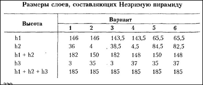 Поскольку современная метрическая система египтянам не была знакома, разделим высоту пирамиды (185 метров) на 12 равных частей (одна часть 15,42 метра) и 1/12 часть высоты примем за условную единицу измерения длины. Размеры слоев, выраженные в единицах длины, равных 1/12 части высоты пирамиды, представлены в табл. 3
