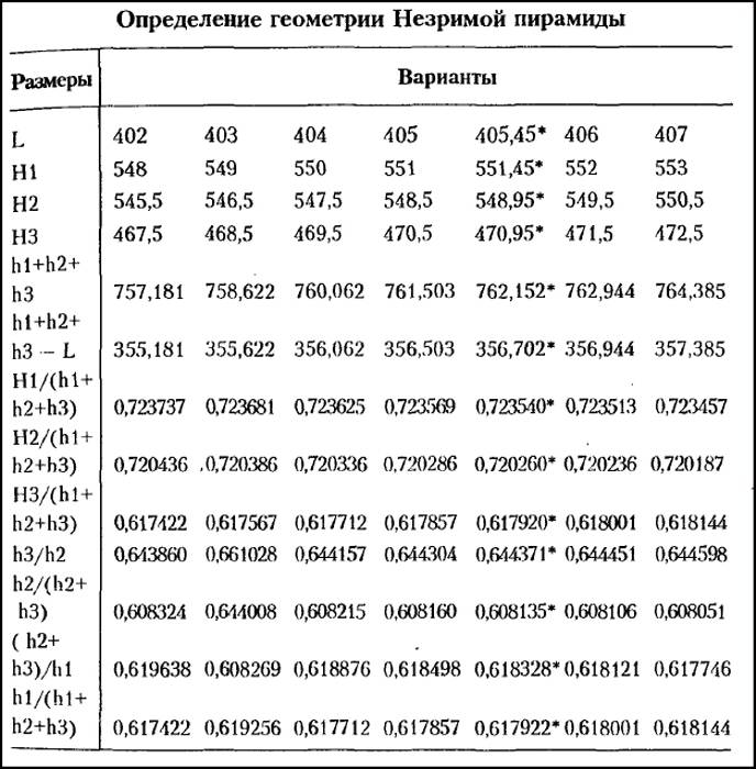 Чтобы понять то, ради чего составлены таблицы, попробуем взглянуть на проблему иначе. Определим, какие объемы, наиболее близкие к реальным, должны иметь три пирамиды в Гизе, чтобы структура Незримой пирамиды была идеальной. Задача перестанет быть абстрактной, если предположить, что какие-либо элементы комплекса находятся под песком. Не меняя геометрии, мы можем нарастить объем пирамид единственным способом, а именно: прибавив к значениям их высот одинаковое число, определяющее расстояние от уровня поверхности песка до некой плоскости – плиты фундамента, где они стоят. Назовем его глубина, тогда пирамиды, которые мы видим, есть только возвышающаяся над песком часть «айсберга». Глубина прибавляется к известным высотам пирамид, вычисляются измененные объемы, определяется структура новой Незримой пирамиды. Проделывая это несколько раз (на самом деле, используя современные аналитические методы), можно получить оптимальные результаты. В табл. 5 знаком «*» отмечены геометрические характеристики идеальной Незримой пирамиды. Кроме обозначений рис. 2, в табл. 5 используются: H1, Н2, НЗ – известные высоты трех пирамид в Гизе.