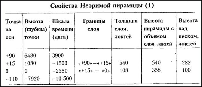 Шкалу делений сместим так, чтобы одна из точек совпала с границей песка, в который погружена пирамида. Рядом с этой точкой поставим отметку «О», а против остальных точек – положительные или отрицательные цифры, соответствующие их удаленности от границы песка (рис. 2). Получилась удобная числовая ось. По не только и не просто удобная. Эту ось тысячелетия назад, без сомнения, строили жрецы. В табл. 7–9 демонстрируются уникальные совпадения, доказывающие, что все, что мы сейчас обсуждаем, не игра воображения.