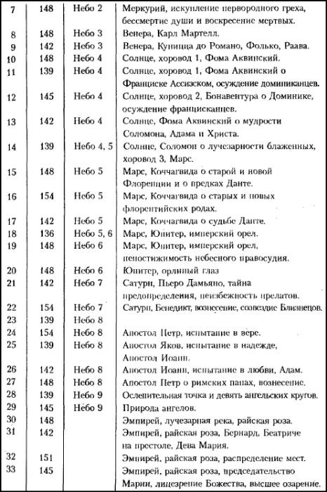 На самом деле деление дает представленный в таблице идеальный результат, если вместо правильного значения иррационального числа 71, равного 3,14159265535998…. берется рациональное число 3,14355601897670. Разница между двумя «пониманиями», что такое число 71, всего лишь 0,0625 %. Для 1321 года такая точность является удивительной, тем более если учесть, что Данте имел дело с целыми числами (число строк не может быть дробным).
