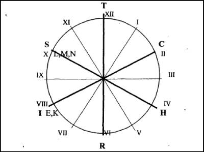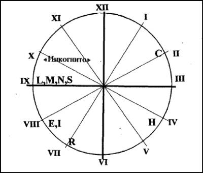 Приступаем к выполнению инструкций. Циферблат со всеми цифрами на нем и буквы «С», «Н», «I, К» оставляем неподвижными, а группу букв «R», «Е», «L, М, N, S» и «Инкогнито» толкаем, как маятник, и они начинают двигаться против часовой стрелки. Перемещающиеся буквы напоминают полчища рыцарей Средневековья, надвигающиеся на не принадлежащую им территорию. Рыцари «Инкогнито», «L, N, S», «Е», «R» монолитной колонной надвигаются на мирно дремлющие и ничего не подозревающие неподвижные буквы «I, К», «Н», «С» и, исчерпав энергию, останавливаются, делая реальностью следующую расстановку букв на циферблате (рис. 5):