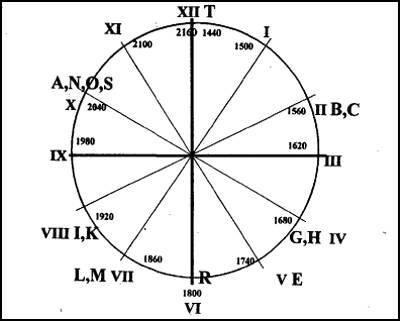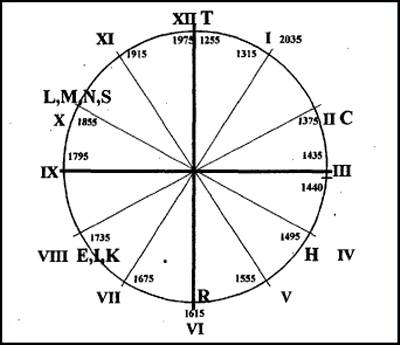 Если знать, какому реальному историческому интервалу времени соответствует промежуток в 7 часов Нострадамуса, мы бы могли назвать не только время, когда часовая стрелка находилась на позиции «XII», но и сказать, что нам показывают часы при любом положении часовой стрелки. Ключевым в решении вопроса о масштабе времени стало выяснение, какой промежуток времени отмеряет час часов Нострадамуса. Здесь очень полезной оказалась буква «L».