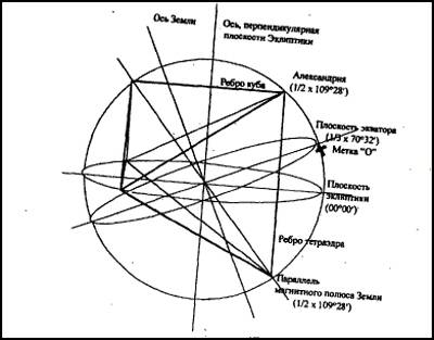 109°28′ и 70°32′ – углы, которые пробегает луч при сканировании из центра сферы ребер соответственно тетраэдра и куба, вписанных в сферу. При этом координата самой южной из вершин тетраэдра 78°14′40″ северной широты: