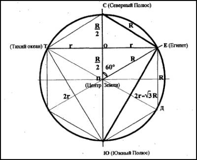 Выводы. Линейное расстояние от Северного Полюса до пирамиды Хеопса равно радиусу Земли (с высокой степенью точности!). Линейное расстояние от Северного полюса до пирамиды Хеопса является стороной равностороннего шестиугольника, вписанного в окружность Земли. Треугольник ЕЦЮ – равнобедренный (у него две стороны равны радиусу Земли) и имеет угол при вершине Ц (угол ЕЦЮ), равный 120°.