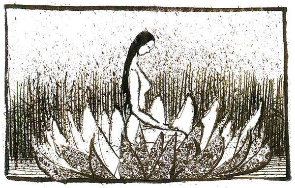 Вдруг видит он, как из глубины что-то большое и белое быстро-быстро вверх идет, все в серебряных пузырьках. Это лилия-царица со дна поднимается – огромная, величиной, наверное, с лодку. Как на поверхности оказалась – стала распускаться. Разошлись в стороны нежные лепестки, и увидел Нил, что внутри цветка сидит красивая молодая женщина. Вся нагая, укрыта лишь длинными распущенными черными волосами, и глаза у нее закрыты, будто у спящей, а на голове корона из зеленых речных стрекоз с красными глазами.