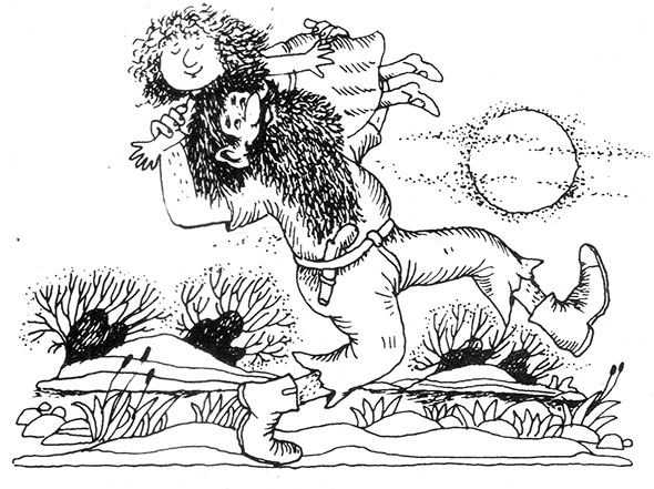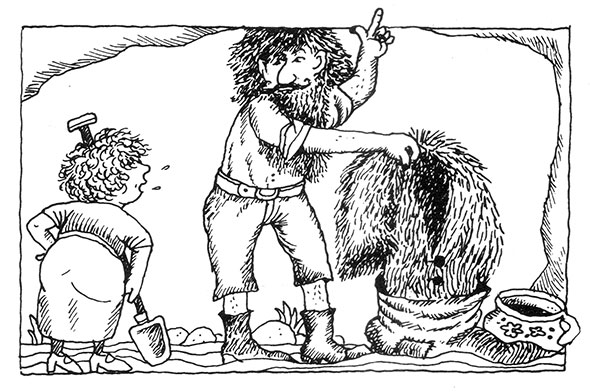 Грабш так удивился, что не успел ничего проворчать и отправился вместе с Олли. Он собирал ягоды в большое ведро для мытья полов, а она – в суповой котел. Они начали прямо у пещеры и постепенно удалялись в сторону водопада. Она собирала гораздо быстрее, ведь это была ее привычная работа. А ему приходилось нелегко: толстыми пальчищами он давил большую часть ягод, и ужасно мешалась борода. Она все время застревала в колючих зарослях, да так крепко, что Олли приходилось бежать домой за ножницами, чтобы освободить мужа. В третий раз вырезав кусочек бороды, застрявший в колючках, Олли аккуратно разделила бороду на две пряди, закинула их Грабшу за спину справа и слева и подвязала на затылке. Теперь борода не мешала, и можно было собирать в свое удовольствие. Но когда она набрала полный котел, у Грабша было только полведра ежевики, так что Олли помогла ему, и скоро они вместе набрали полное. А потом она отвязала бороду.