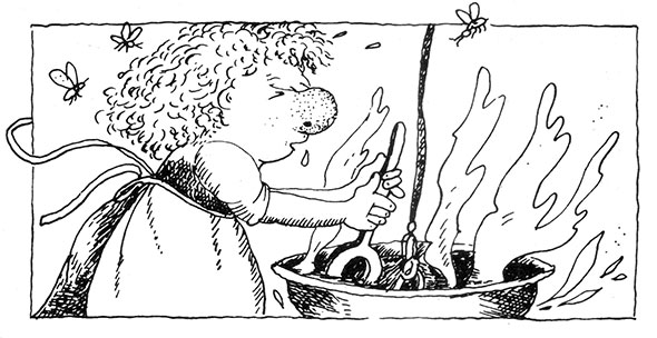 – Варенье помешай, подгорит, – еле слышно всхлипнула она. Через четверть часа нос у нее раздулся, как свиной пятачок, а глаза опухли. Остались узкие щелочки, и через них почти ничего не было видно. Лицо превратилось в настоящую поросячью мордочку. Но Олли выбралась из-под сена, отобрала у Грабша длинную поварешку и продолжила мешать варенье. Глядя на нее, разбойник не мог удержаться от смеха.