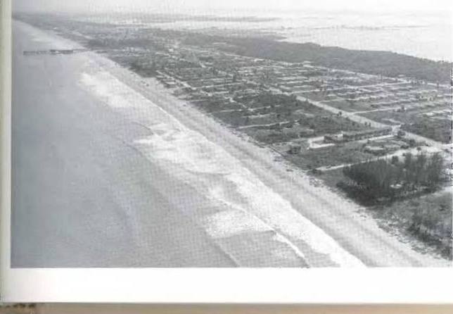 Вид с воздуха на Коко-Бич к югу от мыса Канаверал в ранние золотые годы пилотируемой космической программы. Сегодня эта полоса застроена высотными жилыми комплексами и гостиницами.