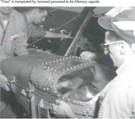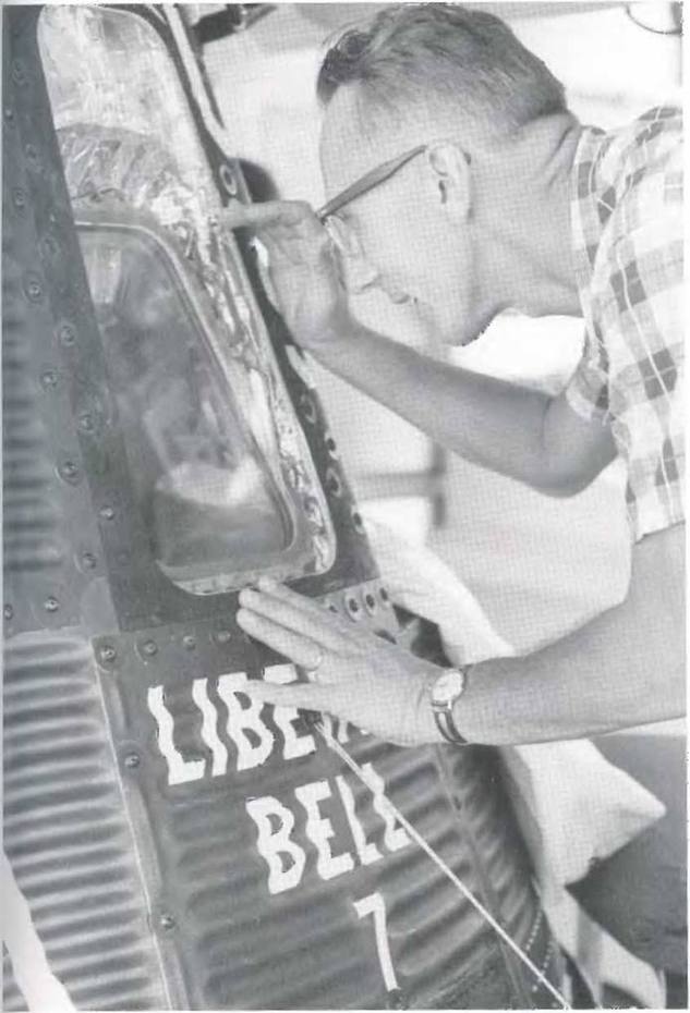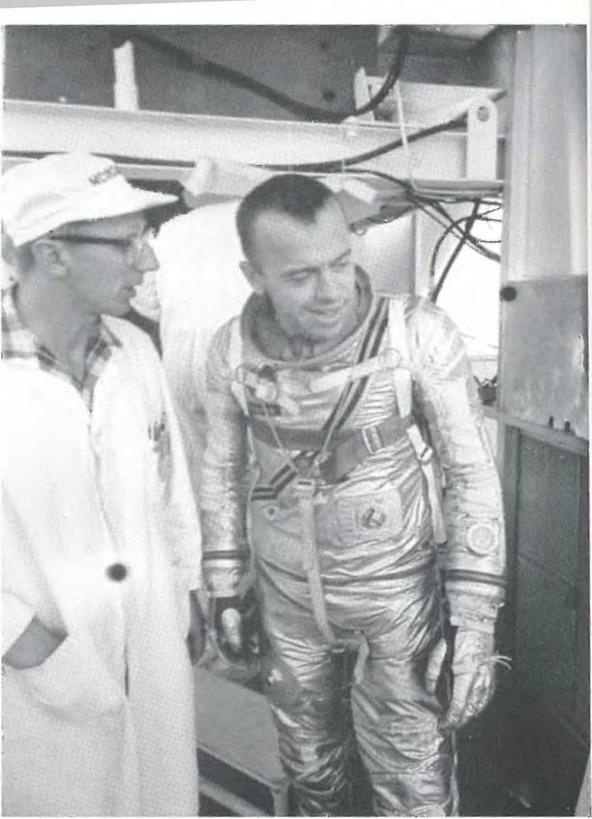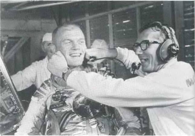 Гюнтер подбадривает астронавта Джона Гленна после особенно долгого сеанса в тесной капсуле «Меркурий» на стартовом столе № 14.