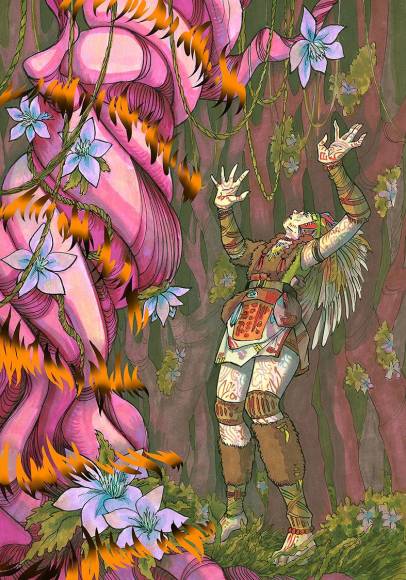 Прямо напротив неё, практически срывая шнуровку с её груди копьём, замер высокий воин. Краска и толстый слой жира подчёркивали кубики и рельефы мускулов. Лицо покрывало не меньшее количество краски, а волосы, которые можно было с трудом разглядеть среди пёстрого головного убора, лоснились от какого-то маслянистого состава. Брови сходились треугольником, усиливая и без того свирепое выражение раскосых глаз.