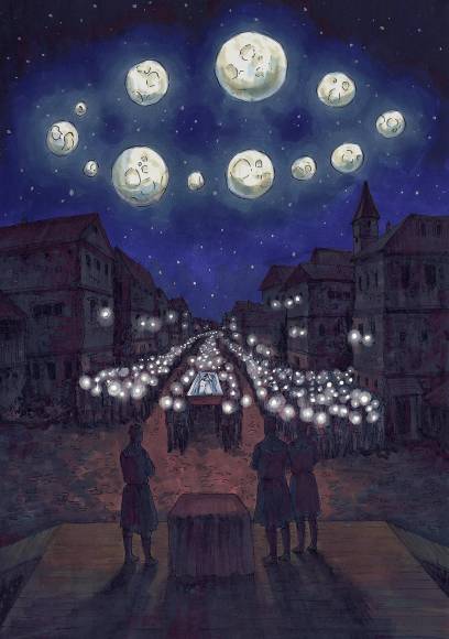 Первый огонёк. Второй, третий, пятый. На дорогу будто выплёскивали светлячков из банки. Показались стройные шеренги солдат, которые сопровождали несомый на плечах гроб. Они шли очень медленно, каждый нёс по светильнику. При их приближении свои светильники зажигала уже толпа, будто подсвечивая взлётную полосу для того, кто должен вот-вот отправиться на небеса. И чем ближе приближалась процессия, тем ярче горела площадь, пока от огней не зарябило в глазах. Озарились окна, казалось, весь Карраж утонул в огнях. Будто читая желание толпы, погода прояснилась, порыв ветра поколебал фитильки и сдвинул тучи на небосводе. Пояс Рити засиял во всём своём великолепии, и народ единодушно ахнул. Молитвы говорили и пели уже практически в полный голос, но умолкали, стоило покойнику оказаться рядом.
