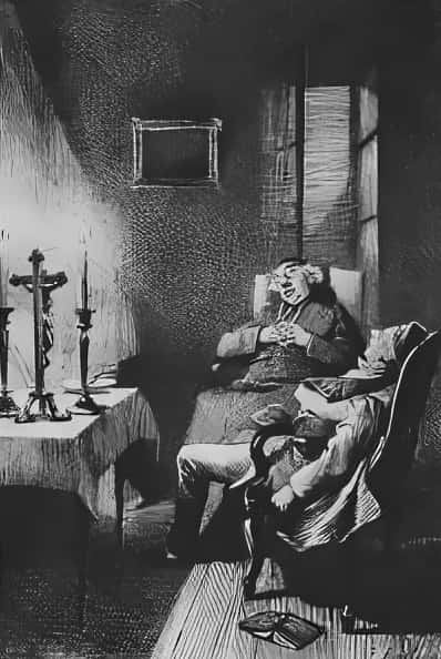 Им овладело жестокое любопытство: весь дрожа, он медленно, кончиками пальцев приподнял вуаль. Вопль ужаса, вырвавшийся у него, разбудил обоих спящих. Они увели его вниз, в столовую.