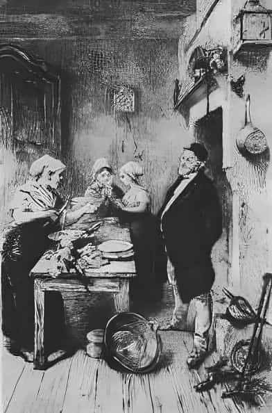 Он направился в маленькую комнату, но оттуда надо было прежде выпроводить трех мельников. И пока ему накрывали на стол, он все время молча стоял у печки; потом, как обычно, затворил дверь и снял фуражку.