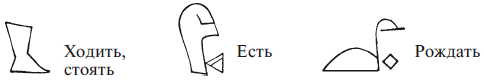 Изображение головы с выделенным ртом и кусочком хлеба рядом с ним ясно представляло смысл глагола «есть». Птица, сидящая на яйце, была одним из способов изобразить смысл глагола «рождать».
