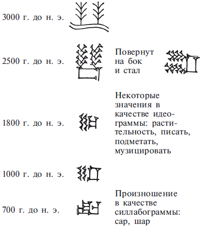 Значок шумерской письменности, используемый таким образом с учетом только его звуковой оболочки безотносительно предмета, который он первоначально изображал, известен нам как «силлабограмма». Один и тот же значок мог, конечно, быть пиктограммой или силлабограммой в зависимости от того, как его использовали. На самом деле шумерские писцы очень быстро упростили формы своих изначальных пиктограмм, так что вскоре в большинстве из них уже нельзя было узнать рисунки (рис. 26).