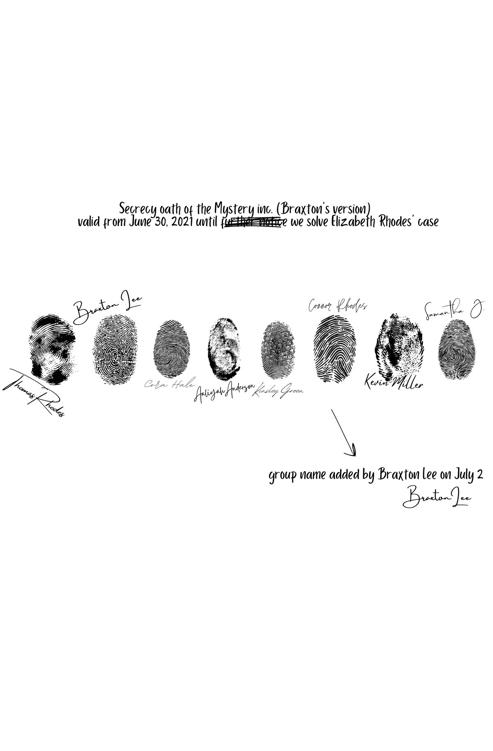 – После того как мы обнаружили в квартире Джонсов фотографии кольца Элизабет Роудс и Джошуа Роудса, мы попытались составить план. В последний раз, когда Бракстон устраивал вечеринку, появился Эрик, как мы его тогда знали, человек в маске, поэтому вечеринка 4 июля казалась нам лучшим шансом заманить его. На вечеринке мы были начеку, пытаясь найти их, прежде чем они найдут нас. Когда Кора прислала мне сообщение, что она видела Саманту, я переслала его Томасу, который затем предупредил всех остальных. Тогда Кевин позвонил вам за подмогой. Я уже подозревала Кору, потому что нашла тесто на поверхности кольца Лиззи. Она любит печь, но этого было недостаточно, чтобы я была уверена, что она в этом замешана... пока она не привела меня на пустую поляну. Пока я разговаривала с Корой, остальные выполняли свою часть плана.