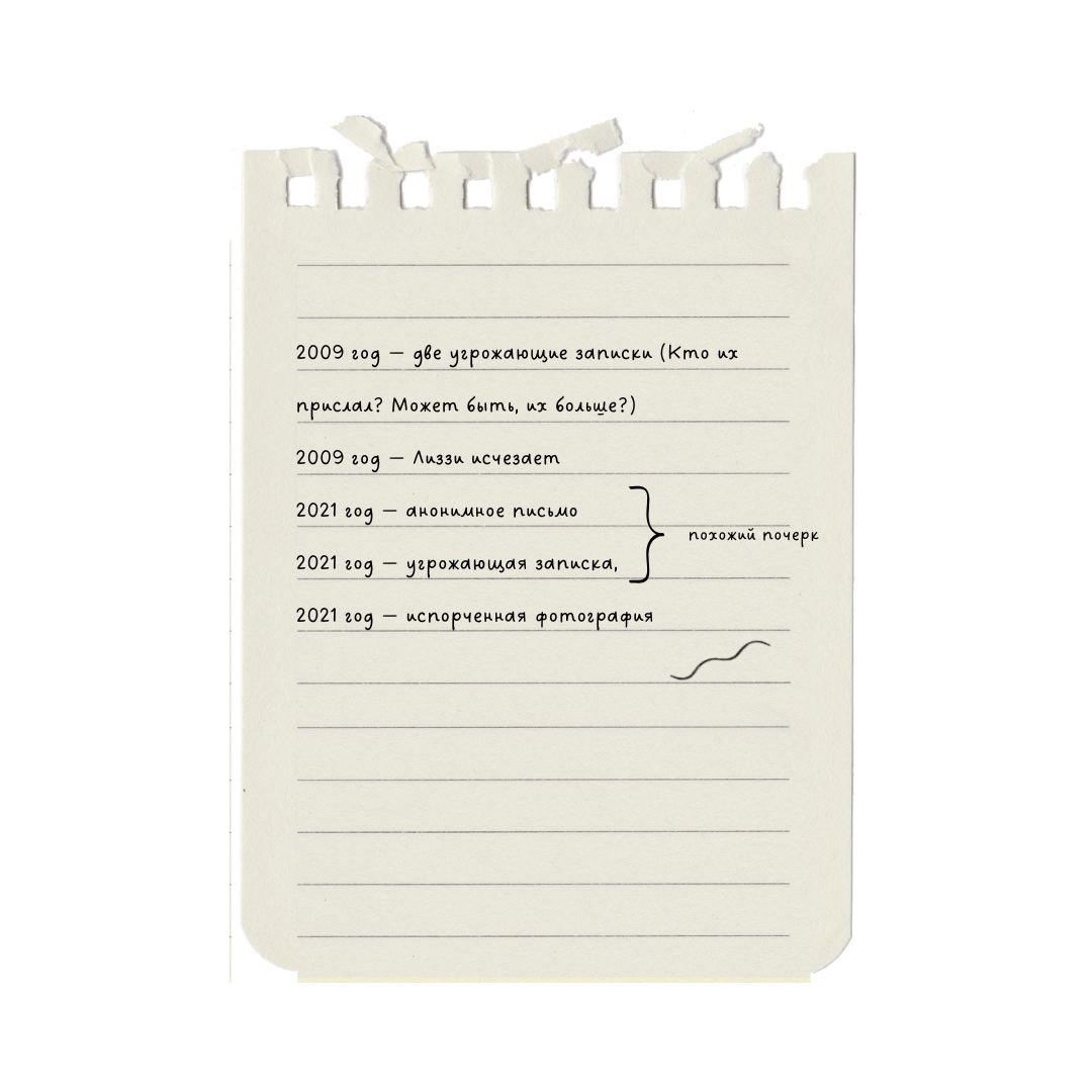 Мы были в комнате Томаса, сидя на его кровати, пока он проверял все окна и двери в доме, чтобы убедиться, что они заперты. Я принесла три записки из гостевой комнаты – две, которые мы нашли в тетради Лиззи, и одну, оставленную для нас на двери – и разложила их на простыне рядом с фотографией и письмом.