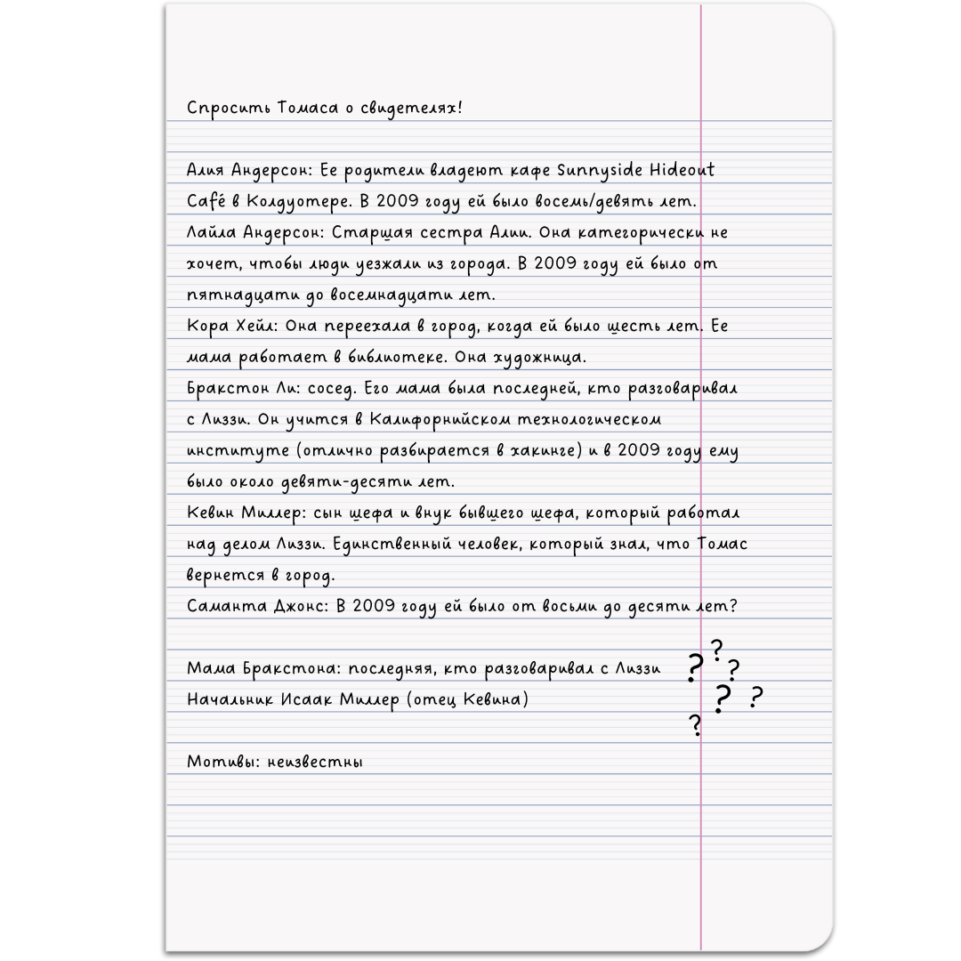 – Ты знаешь, где он хранит свои бумаги и ручки? – спросила я, и Коннор подошел к столу Томаса. Он вытащил верхний ящик и поднял лист бумаги и ручку. Это имело смысл. Томас был аккуратным. Я почти никогда не находила свои ручки там, где их оставляла. Он положил их передо мной, и я легла на живот, записывая то, что мы уже знали. Я сжала губы, сосредоточившись.