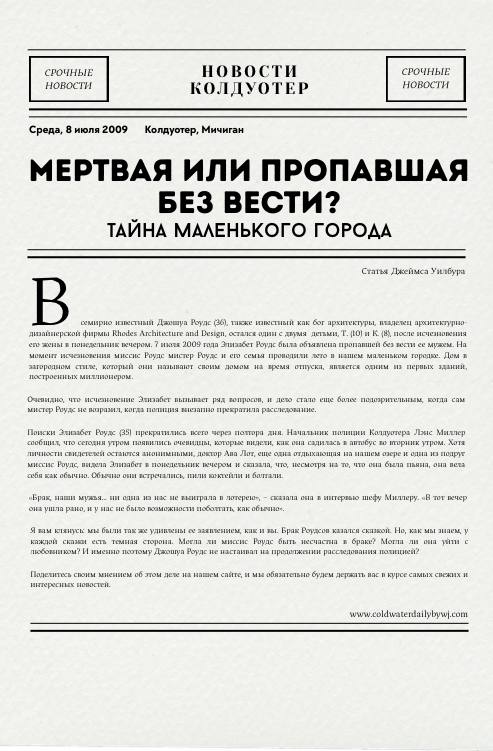 Я так и думала. Если были допросы, то в деле пропавшего человека должен был быть официальный отчет о них. А если часть этого дела не была в полицейском участке, то вторым лучшим вариантом всегда был человек, который работал над этим делом. Я прочитала заголовок и вздрогнула, взглянув на Томаса. Его глаза быстро пробежали по тексту статьи, но он не проявил никакой особой реакции на безвкусный заголовок.
