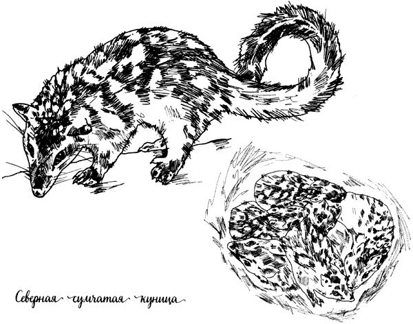 На севере Австралии обитает северная сумчатая куница, напоминающая крысу с большими глазами, длинной острой мордочкой и взъерошенным хвостом. Как и кенгуру, эта куница относится к сумчатым. У этих живородящих животных детеныши появляются на свет недоразвитыми; словно живые бобы, они доползают до сумки матери, где питаются молоком и растут до тех пор, пока не станут самостоятельными. Сегодня ареал северной сумчатой куницы подвергается разрушению – люди все дальше в него вторгаются, застраивая местность. К тому же на этих куниц нередко нападают более крупные хищники – динго, домашние собаки и кошки.