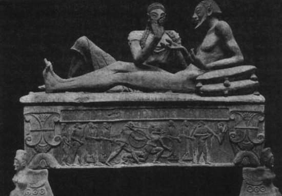 Сходство становится еще более разительным, когда Хорн устанавливает у себя в гостиной гроб с мумией Тутайна, по форме напоминающий сундук. Ниже, просто для примера, этрусский саркофаг: