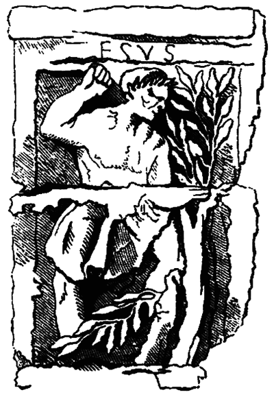«Тот, кто валит дуб» – это может быть кельтский бог, миф о котором известен только по двум рельефам. На рельефе из Парижа, украшающем «алтарь корабельщиков» начала I века н. э., изображен бородатый человек, замахнувшийся топором, которым он обрубает ветви или рубит само дерево. В верхней части рельефа высечено имя «Езус». На соседнем рельефе изображен бык со стоящими на его спине тремя журавлями. На рельефе алтаря, найденного в Трире, – безбородый человек, рубящий дерево. В листве дерева можно различить голову быка и трех журавлей, сидящих на ветвях.