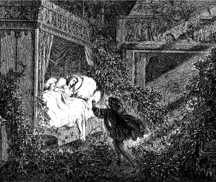 Прошел королевич множество комнат, в которых, кто лежа, кто стоя, спали придворные кавалеры и дамы. Наконец вступил он в позолоченный покой – и видит на кровати с раздернутыми занавесами прекраснейшее зрелище: принцессу не то пятнадцати, не то шестнадцати лет, и прелести ослепительной, небесной.