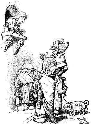Когда торжество началось, три тетки вошли в залу, очень странно одетые, и невеста, обращаясь к ним, сказала: «Милости просим, милые тетушки!» – «Ах, – сказал жених, – как это ты можешь дружить с такими уродинами?» Затем он подошел к одной из трех прях, с широкой ступней, и спросил: «Отчего это у вас ступня такая широкая?» – «От нажима, – ответила она, – от нажима». Тогда жених подошел к другой пряхе и спросил: «Отчего у вас губа такая отвислая?» – «От смачивания, – сказала она, – от смачивания нити». Тут обратился он к третьей: «Отчего у вас такой большущий палец?» – «От скручивания нитки, – сказала она, – от скручивания нитки». Королевич испугался и сказал себе: «Ну, уж моя-то красавица жена больше не притронется к колесу прялки».