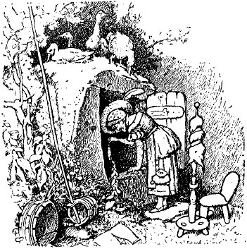 Пошла девушка по этой лужайке и пришла к печке, которая была хлебами наполнена. Хлебы ей крикнули: «Вынь ты нас, вынь скорее, не то сгорим! Мы давно уже испеклись и готовы». Девушка подошла и лопатой повынимала их из печи.