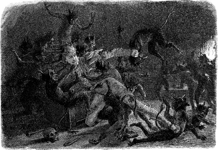 Но королевич сидел совершенно спокойно, и страх не брал его. Тут вдруг все чертенята разом вскочили с земли и бросились на него, и было их так много, что он не мог с ними справиться. Они рвали его, таскали по земле, щипали, кололи, били и мучили, но королевич не произнес ни звука. Под утро чертенята исчезли, а королевич был до такой степени истомлен, что едва мог шевелиться.