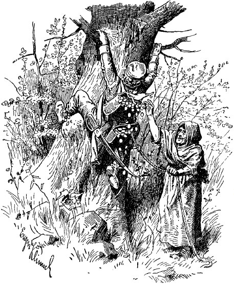Но королева была женщина умная, умела не только в каретах разъезжать. Взяла она большие золотые ножницы, изрезала на лоскутки штуку шелковой материи, сшила крошечный хорошенький мешочек, насыпала в него мелкой гречневой крупы, привязала его на спину принцессе и потом прорезала в мешочке дырочку, чтобы крупа могла сыпаться на дорогу, по которой ездила принцесса.