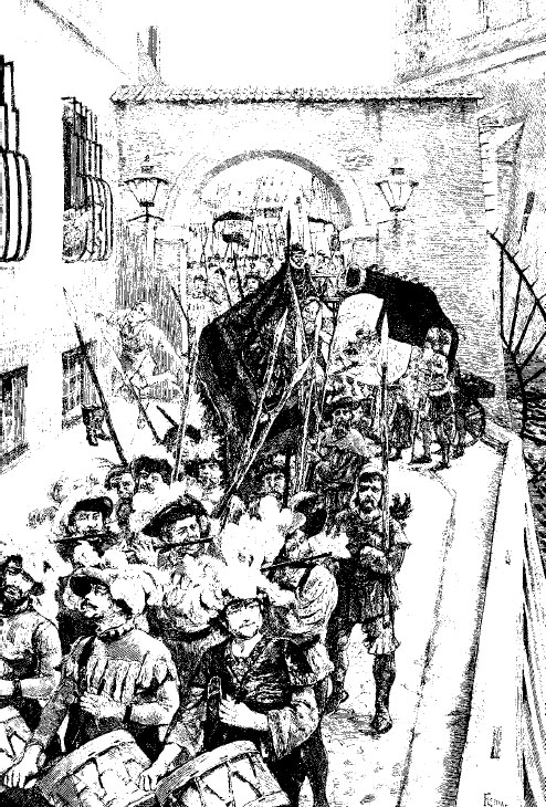 За городом построили огромную виселицу, вокруг стояли солдаты и сотни тысяч народу. Король и королева сидели на роскошном троне прямо против судей и всего королевского совета.